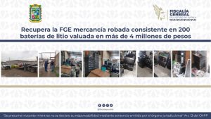 Recupera la FGE mercancía robada consistente en 200 baterías de litio valuada en más de 4 millones de pesos