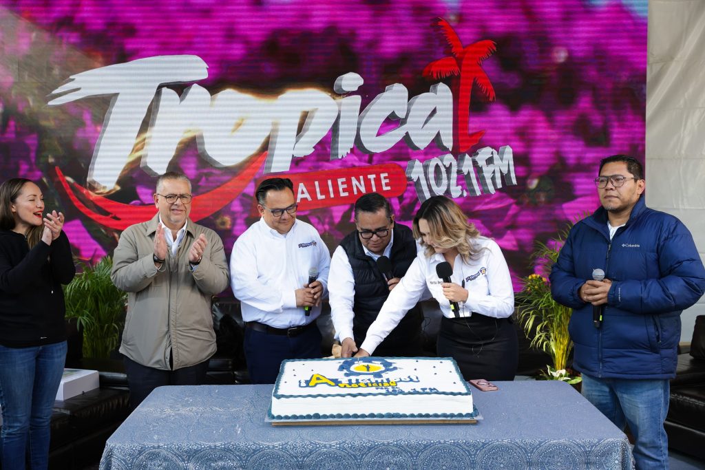 Puebla, Pue. – Entre pastel, aplausos y transmisión en vivo, el noticiero radiofónico A Tiempo Noticias de La Tropical Caliente 102.1 FM celebró su primer aniversario con un festejo especial en la explanada del Teatro Principal, en pleno Centro Histórico de Puebla.