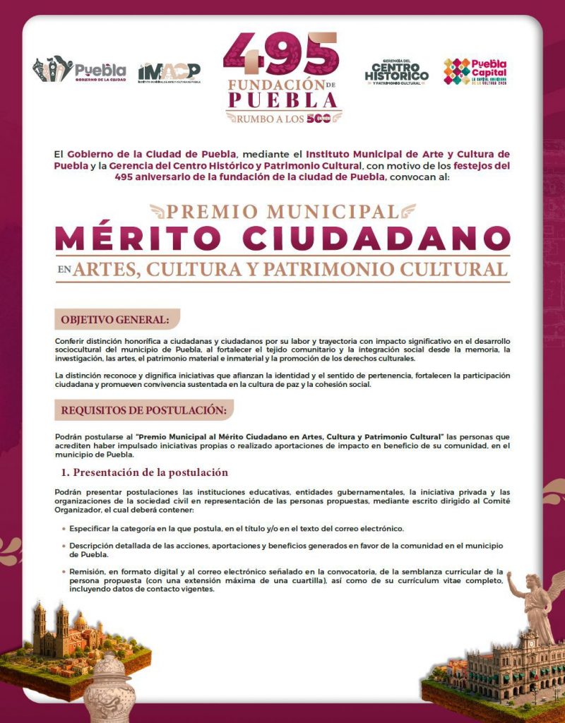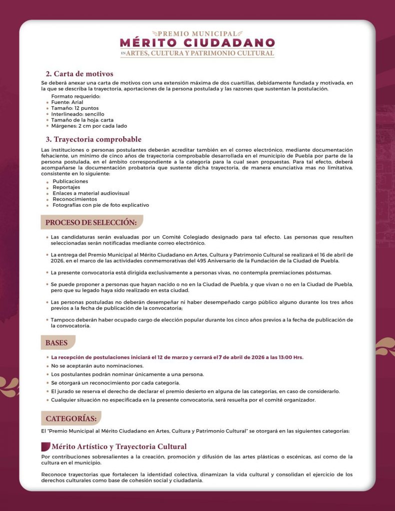 Puebla, Pue., 30 de marzo de 2026.- La convocatoria para participar en el “Premio Municipal al Mérito Ciudadano en Artes, Cultura y Patrimonio Cultural” cierra este 07 de abril, reconocimientos a través de los que se distinguirá a personajes destacados en su labor y trayectoria y que han impactado de manera significativa en el desarrollo sociocultural del municipio de Puebla_