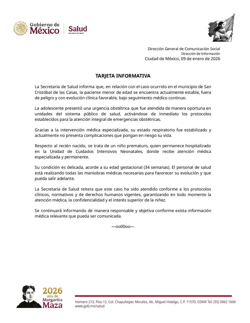 La Secretaría de Salud informó que, en relación con el caso ocurrido en el municipio de San Cristóbal de las Casas, la paciente menor de edad se encuentra actualmente estable, fuera de peligro y con evolución clínica favorable, bajo seguimiento médico continuo. De acuerdo con la dependencia, la adolescente presentó una urgencia obstétrica que fue […]
