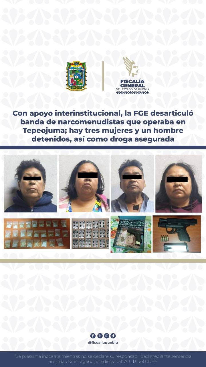 Con apoyo interinstitucional, la FGE desarticuló banda de narcomenudistas que operaba en Tepeojuma; hay tres mujeres y un hombre detenidos, así como droga asegurada