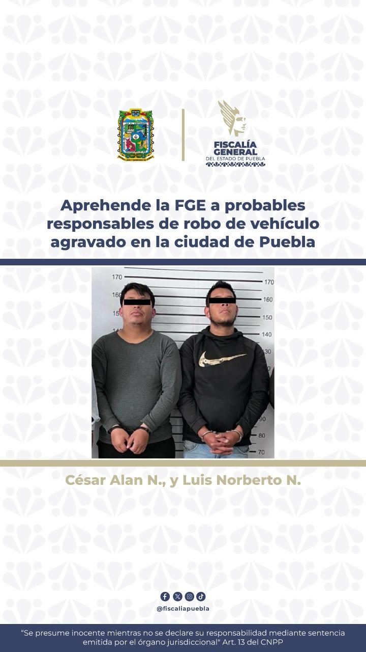 La Fiscalía General del Estado de Puebla logró identificar y detener, mediante orden de aprehensión, a César Alan N. y Luis Norberto N.