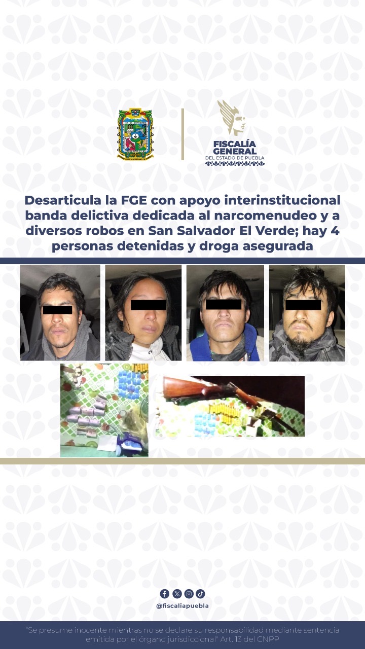 Desarticula la FGE con apoyo interinstitucional banda delictiva dedicada al narcomenudeo y a diversos robos en San Salvador El Verde; hay 4 personas detenidas y droga asegurada