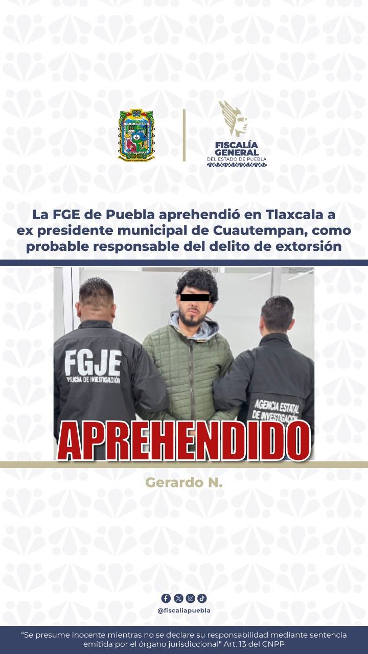 La FGE de Puebla aprehendió en Tlaxcala a ex presidente municipal de Cuautempan, como probable responsable del delito de extorsión