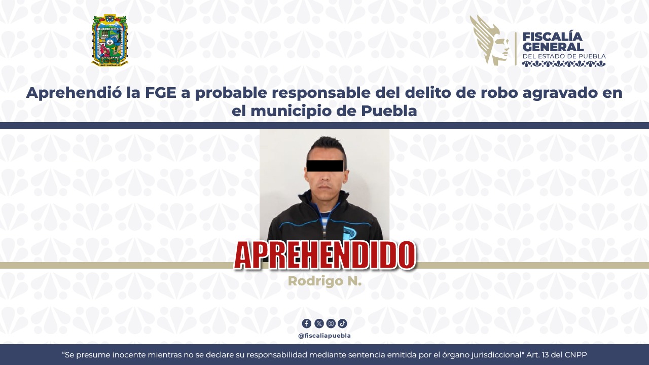 La Fiscalía General del Estado cumplimentó la orden de aprehensión en contra de Rodrigo N., de 35 años de edad, por su probable responsabilidad en el delito de robo agravado, ocurrido en el municipio de Puebla. Los hechos que anteceden a la detención ocurrieron en el año 2024, cuando Rodrigo N., al estar frente a […]