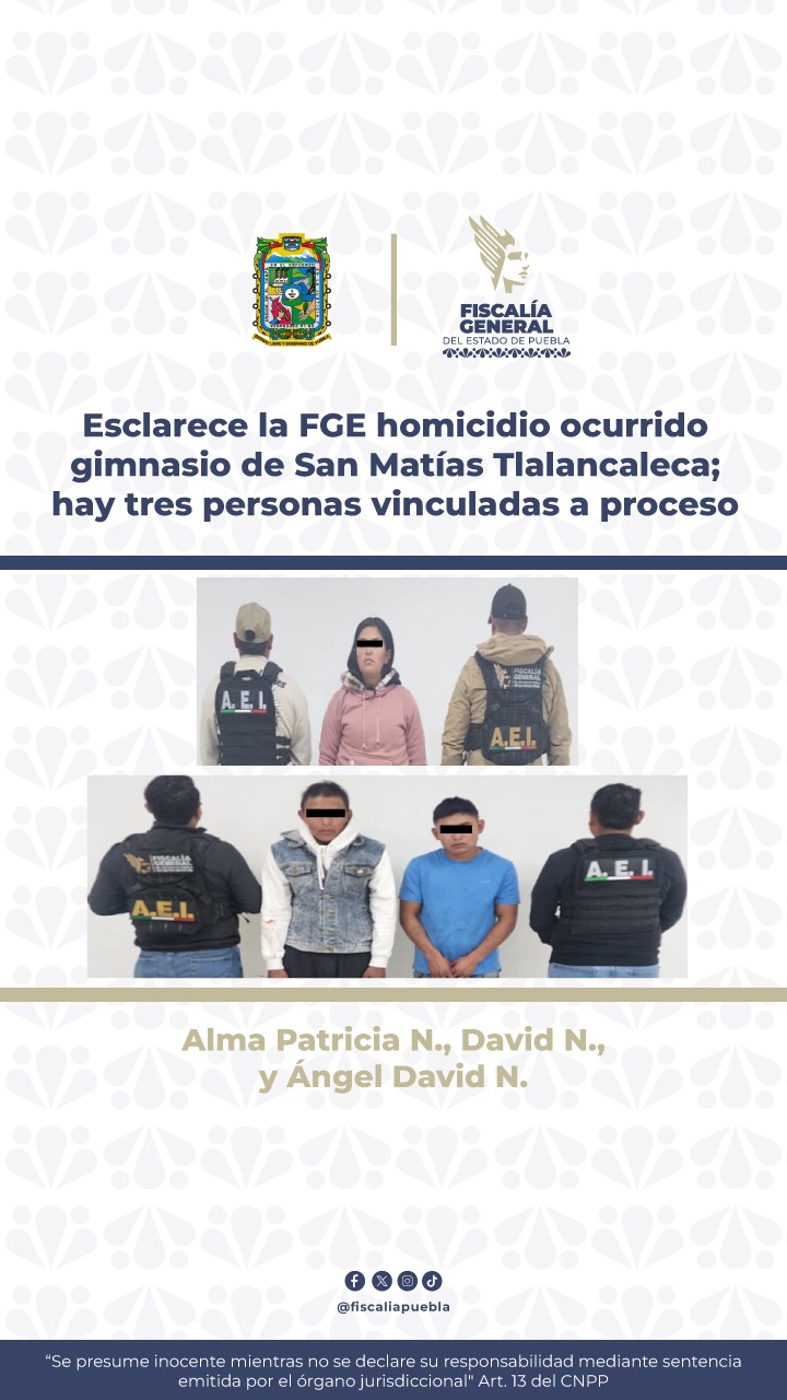 La Fiscalía General del Estado de Puebla logró mediante labores de campo y gabinete, el esclarecimiento del homicidio de un hombre ocurrido en el interior del gimnasio “Club Oxigen”, en el municipio de San Matías Tlalancaleca. Asimismo, se logró la aprehensión y vinculación a proceso de Alma Patricia N., David N. y Ángel David N., […]