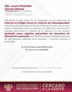 Puebla, Méx.- En redes sociales, la presidenta del Congreso local, Laura Artemisa García, atendió la petición del gobernador Alejandro Armenta y anunció mesas de trabajo y un parlamento abierto, para analizar la ley de Ciberseguridad: Recibo con interés su mensaje gobernador Alejandro Armenta y atiendo su llamado como en esta LXII Legislatura atendemos en general […]