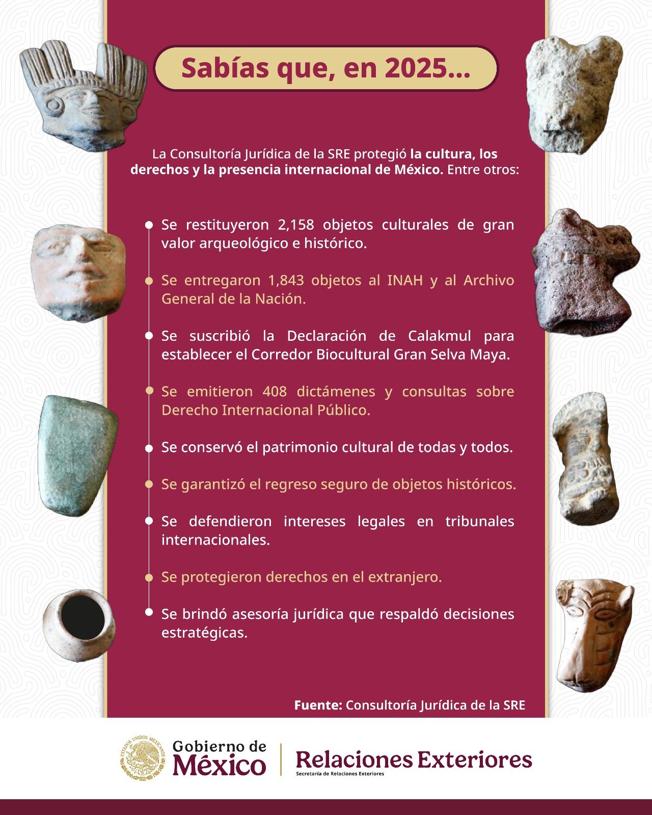 Durante 2025 se logró restituir a México 2,158 objetos culturales de valor arqueológico y documental