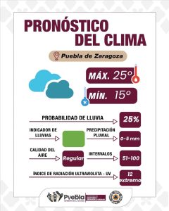 Puebla, Pue., a 17 de julio de 2025.- El Gobierno de la Ciudad informa que este jueves se prevé una temperatura mínima de 16°C y una máxima de 25°C. La probabilidad de lluvia es baja, con acumulaciones estimadas entre 0 y 5 mm, por lo que podrían registrarse lloviznas aisladas. El cielo se mantendrá mayormente […]