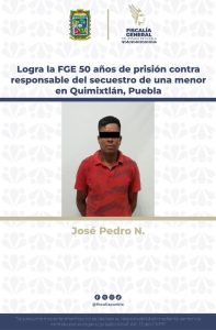 La Fiscalía General del Estado (FGE) de Puebla logró una sentencia de 50 años de prisión contra José Pedro N., declarado penalmente responsable del delito de secuestro agravado contra una menor de 14 años de edad en el municipio de Quimixtlán, Puebla. El 22 de abril del 2024, la víctima acudió al domicilio de José […]