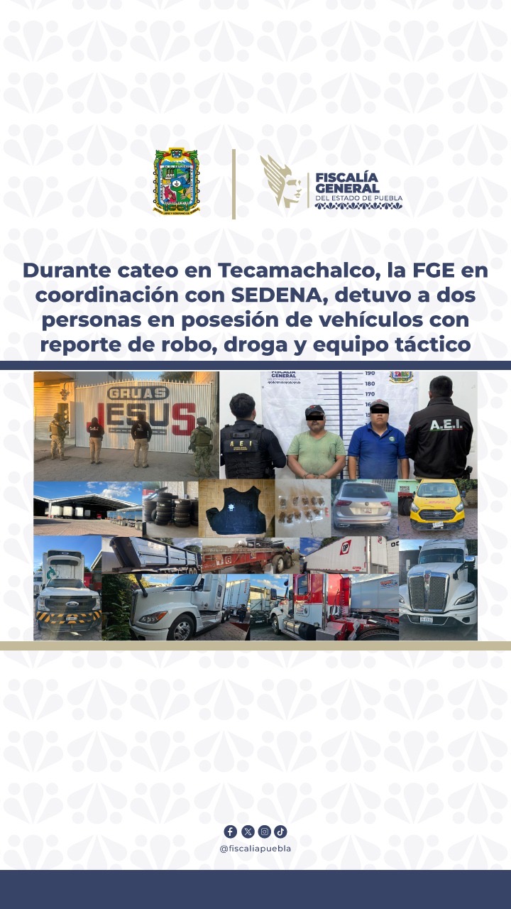 Durante cateo en Tecamachalco, la FGE en coordinación con SEDENA, detuvo a dos personas en posesión de vehículos con reporte de robo, droga y equipo táctico