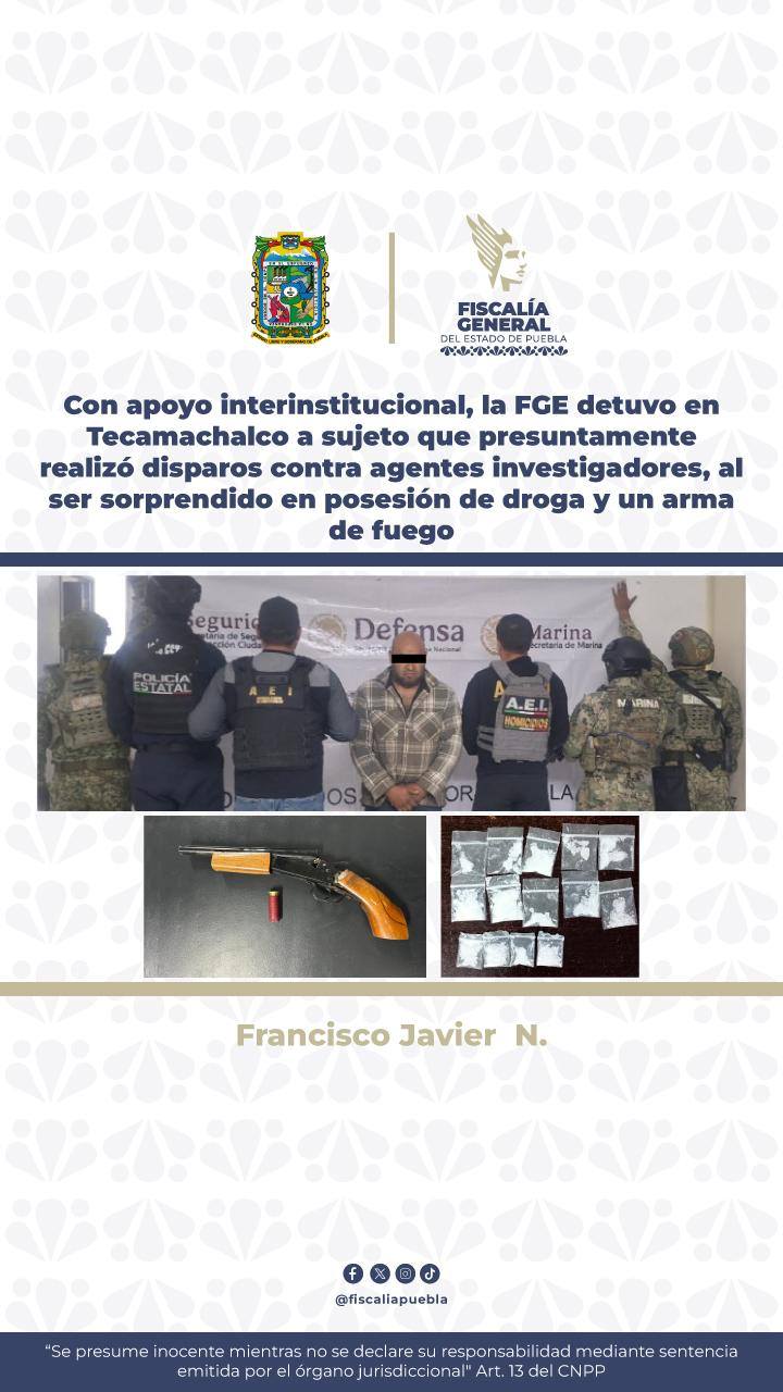La FGE detuvo en Tecamachalco a sujeto que presuntamente realizó disparos contra agentes investigadores, al ser sorprendido en posesión de droga y un arma de fuego