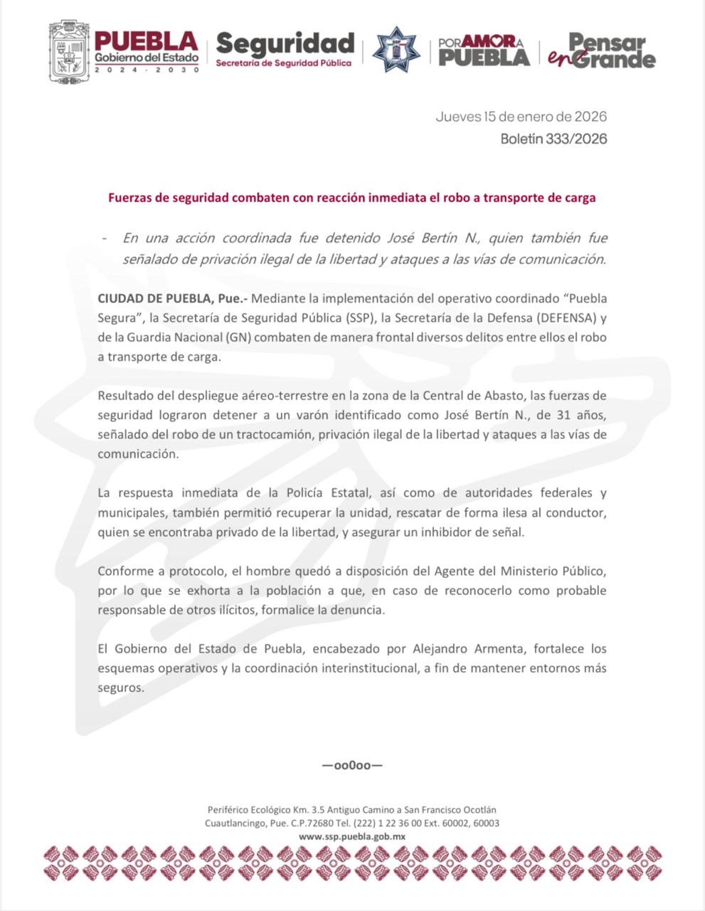 CIUDAD DE PUEBLA, Pue.- Mediante la implementación del operativo coordinado “Puebla Segura”, la Secretaría de Seguridad Pública (SSP), la Secretaría de la Defensa (DEFENSA) y de la Guardia Nacional (GN) combaten de manera frontal diversos delitos entre ellos el robo a transporte de carga. Resultado del despliegue aéreo-terrestre en la zona de la Central de […]